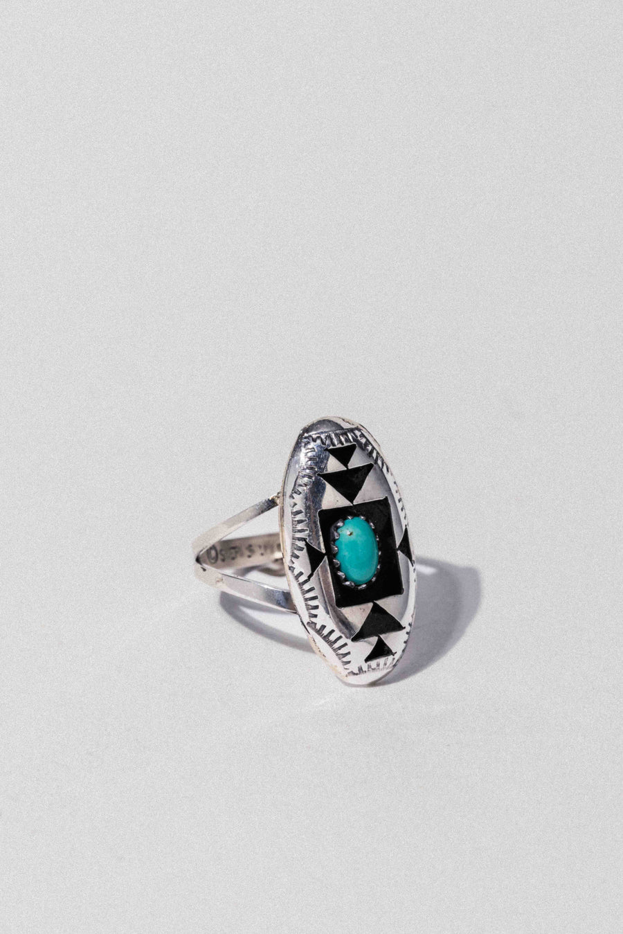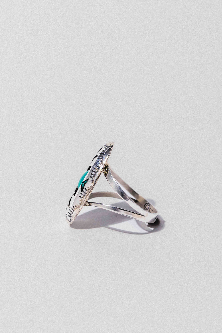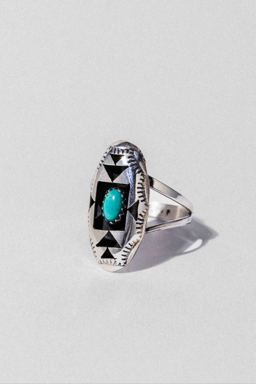 Authentic handcrafted sterling silver ring featuring intricate cut out detailing framing a Tyrone turquoise stone. Known for its rich, ethereal hue, Tyrone turquoise is a rare and highly coveted gem from the Tyrone Mining District in New Mexico. Inspired by desert mystique and ethically sourced from Native American artisans.