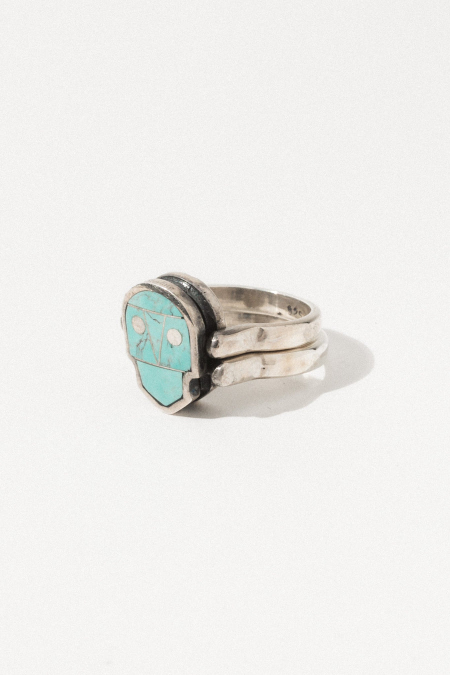 A one-of-a-kind masterpiece. Dual-sided sterling silver bevel ring. Handcrafted with authentic Native American turquoise. Exchangeable skull designs on both sides.