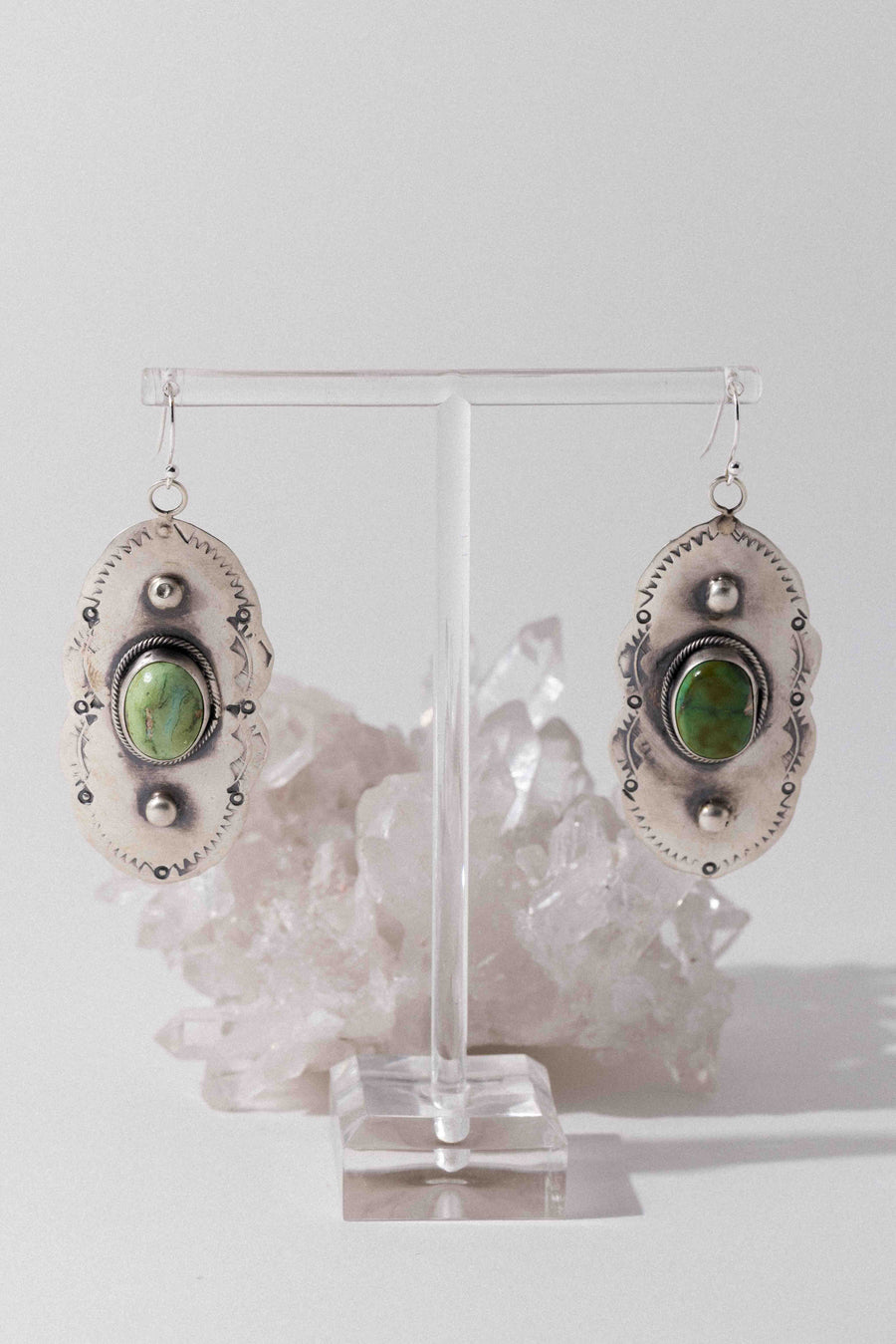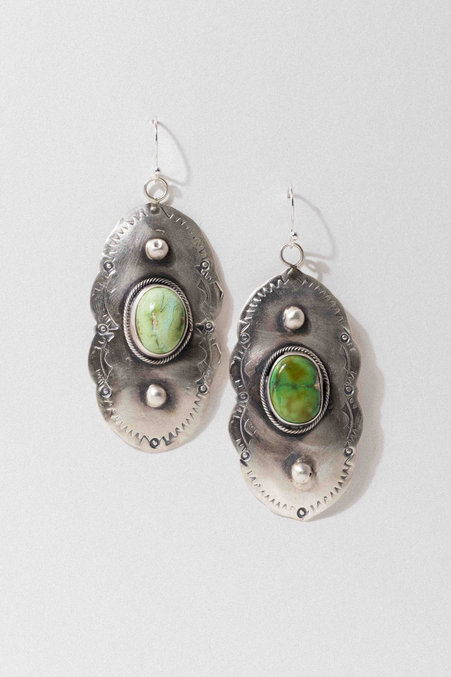 These handcrafted concho earrings feature the soft, earthy elegance of Palomino Variscite, a rare, minty green gemstone found in central Nevada. Palomino Variscite is often mistaken for turquoise but known for its dreamy hues and delicate matrix, making each piece delicately unique. This stone is believed to promote inner peace and grounding. Set in a classic concho style, stamped and formed by hand by a Native artisan. ✦ Measures 2.25 inches x 1 inch / Sterling Silver