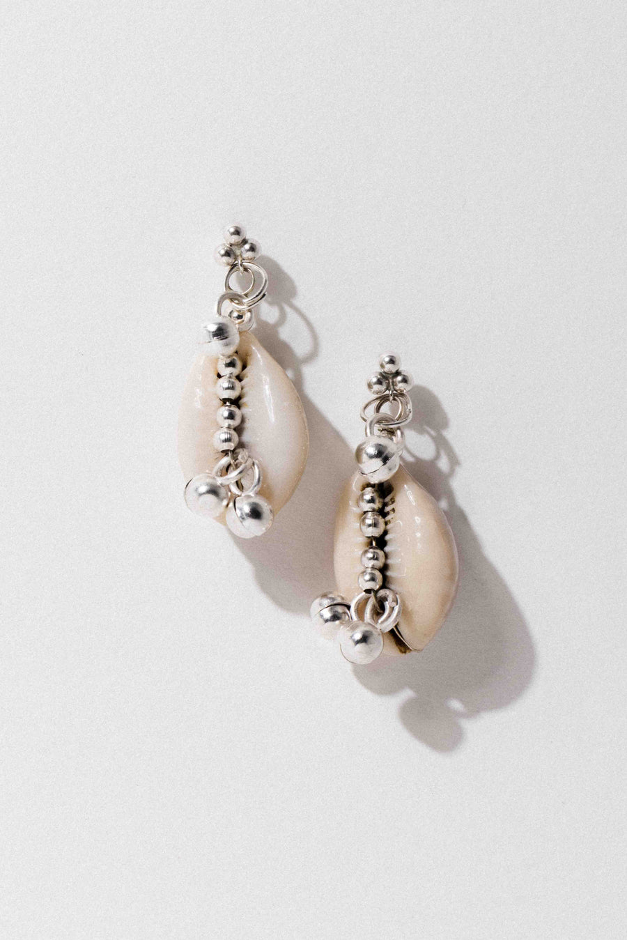 Authentic Indian statement cowry shell stud earrings with dangling adornments. Lakshmi is the famous goddess of wealth, abundance, and fertility. Wear these shell earrings and make the ultimate goddess statement. We've updated this style to be on a Sterling Silver huggie hoop for longevity and an elevated look.